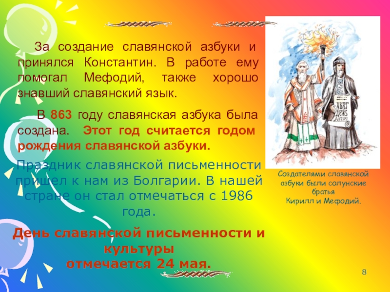 Праздник славянской письменности пришел к нам из Болгарии. В нашей стране он стал отмечаться с 1986 года.
