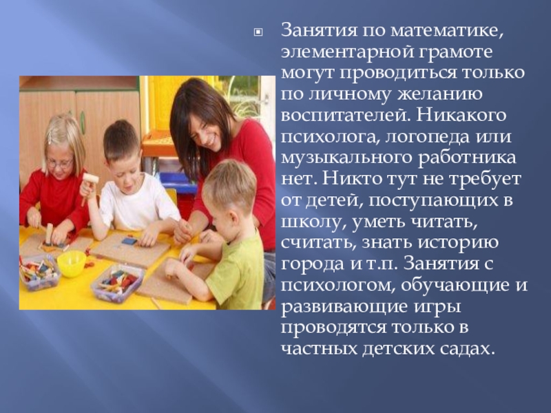 воспитателей. Никакого психолога, логопеда или музыкального работника нет. Никто тут не требует от детей, поступающих в школу, уметь читать, считать, знать историю города и т.п. Занятия с психологом, обучающие и развивающие игры проводятся только в частных детских садах.