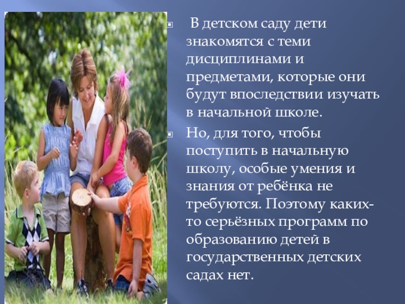 Но, для того, чтобы поступить в начальную школу, особые умения и знания от ребёнка не требуются. Поэтому каких-то серьёзных программ по образованию детей в государственных детских садах нет.