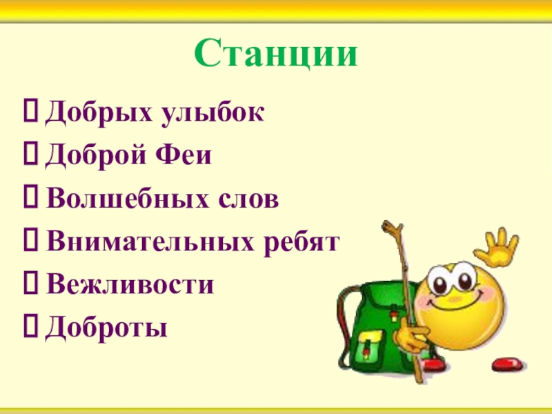 СтанцииДобрых улыбокДоброй ФеиВолшебных словВнимательных ребятВежливостиДоброты