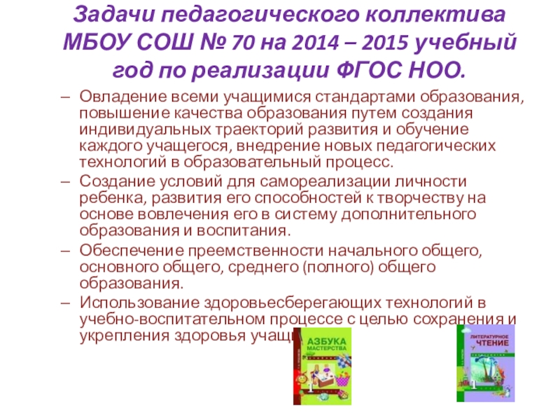 Слайд 3Задачи педагогического коллектива МБОУ СОШ № 70 на 2014 – 2015