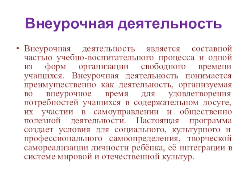 Внеурочная деятельность является составной частью учебно-воспитательного процесса и одной из