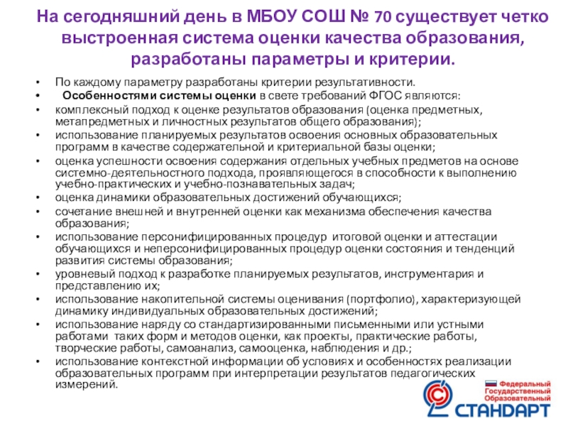 Слайд 7На сегодняшний день в МБОУ СОШ № 70 существует четко выстроенная
