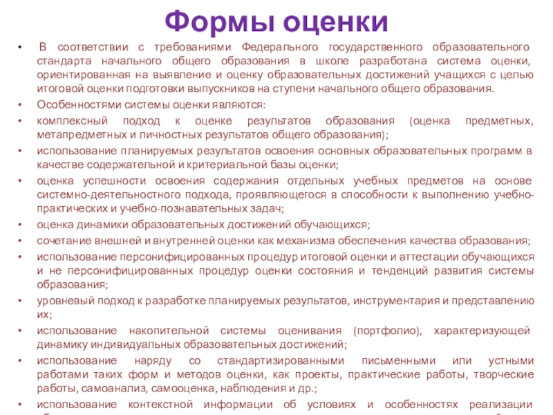 использование наряду со стандартизированными письменными или устными работами таких форм и методов оценки, как проекты, практические работы, творческие работы, самоанализ, самооценка, наблюдения и др.;