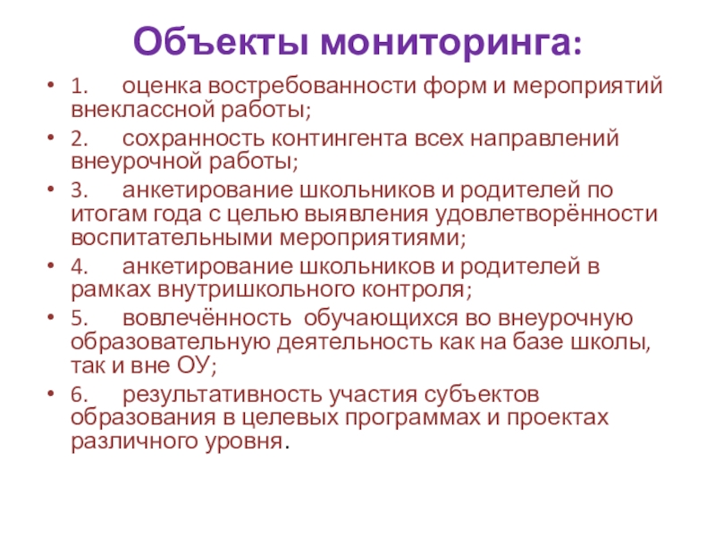 1. оценка востребованности форм и мероприятий внеклассной работы;
