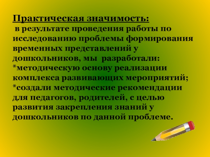 временных представлений у дошкольников, мы разработали: *методическую основу реализации комплекса развивающих мероприятий; *создали методические рекомендации для педагогов, родителей, с целью развития закрепления знаний у дошкольников по данной проблеме.