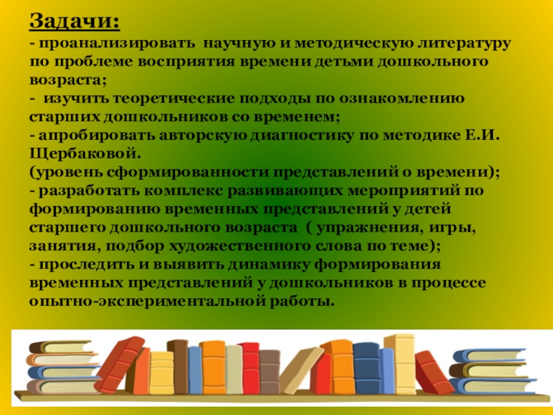 - проанализировать научную и методическую литературу по проблеме восприятия времени детьми