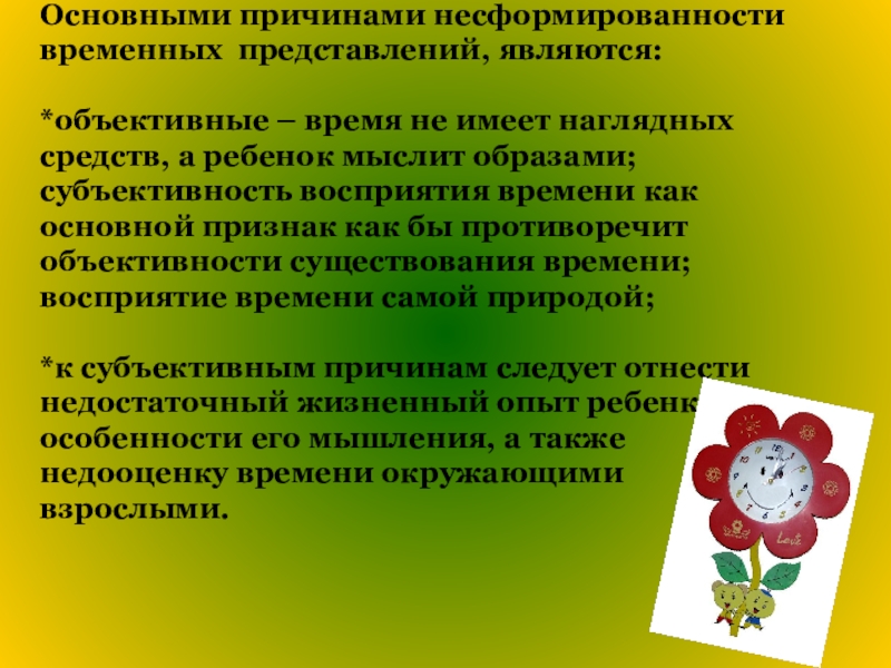 *к субъективным причинам следует отнести недостаточный жизненный опыт ребенка, особенности его мышления, а также недооценку времени окружающими взрослыми.