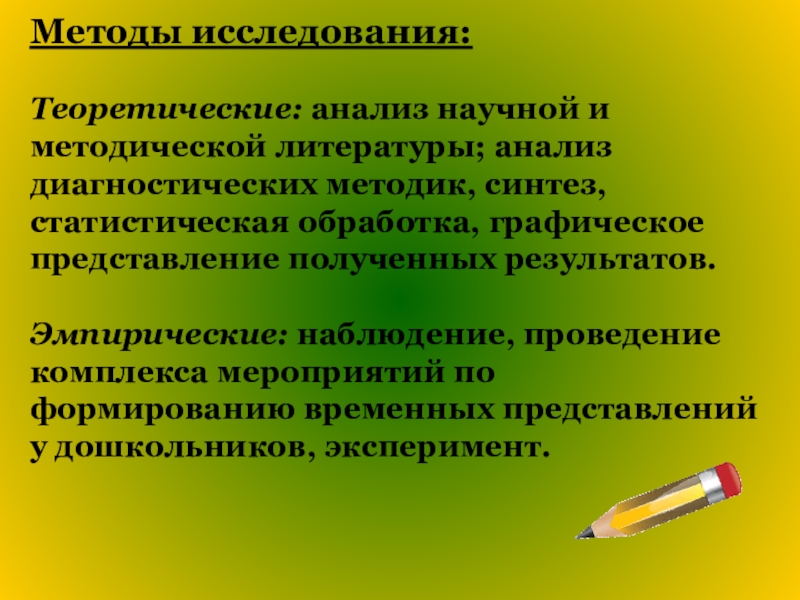 Эмпирические: наблюдение, проведение комплекса мероприятий по формированию временных представлений у дошкольников, эксперимент.