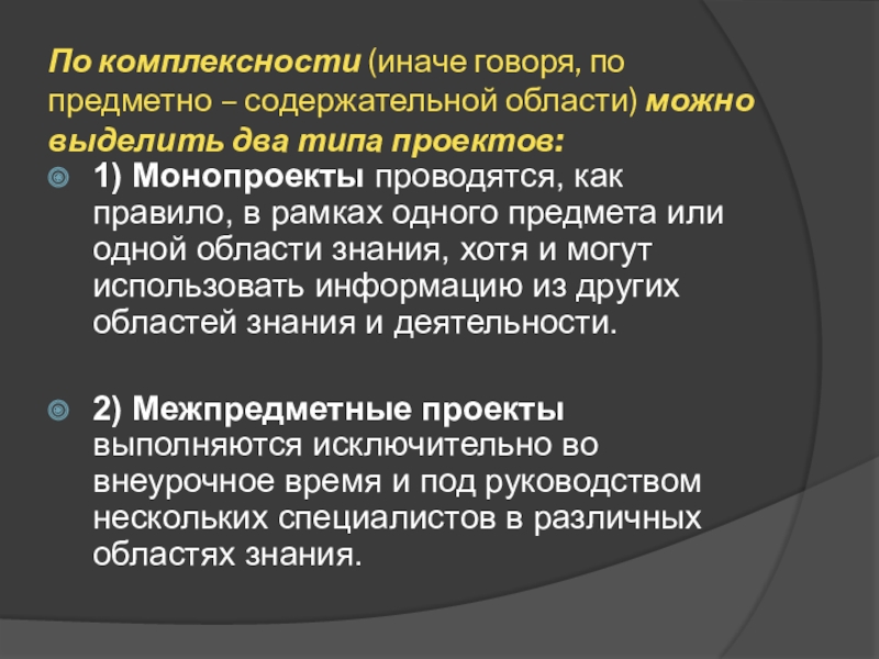 1) Монопроекты проводятся, как правило, в рамках одного предмета или одной области знания, хотя и могут использовать информацию из других областей знания и деятельности.
