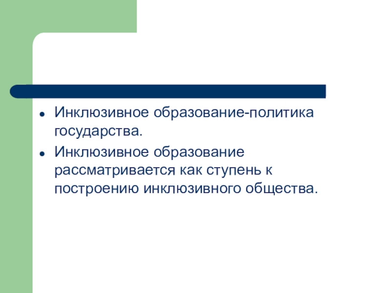 Инклюзивное образование-политика государства. Инклюзивное образование рассматривается как ступень к построению инклюзивного общества.