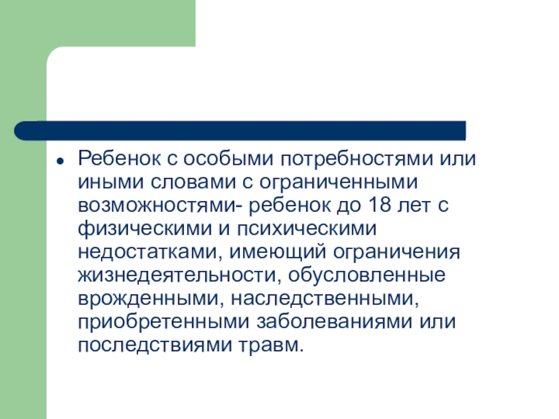 Ребенок с особыми потребностями или иными словами с ограниченными возможностями- ребенок до 18 лет с физическими и