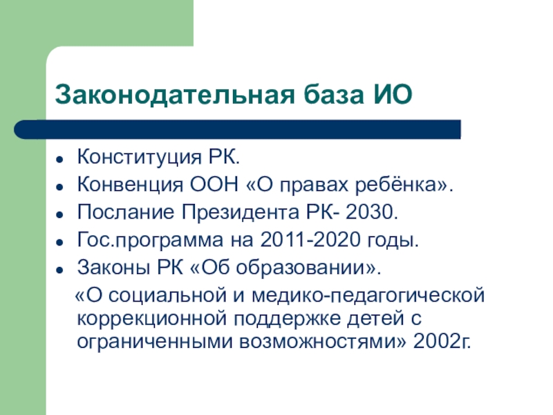 Законодательная база ИОКонституция РК.Конвенция ООН «О правах ребёнка».Послание Президента РК- 2030.Гос.программа на 2011-2020 годы.Законы РК «Об образовании».