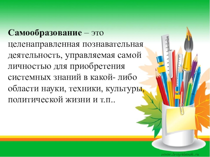 Слайд 3Самообразование – это целенаправленная познавательная деятельность, управляемая самой личностью для приобретения