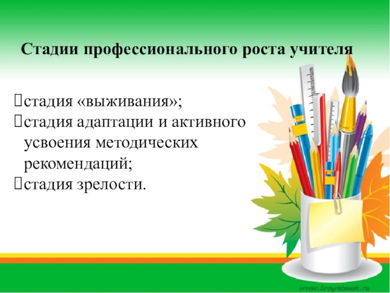 Стадии профессионального роста учителястадия «выживания»;стадия адаптации и активного усвоения методических рекомендаций;стадия зрелости.