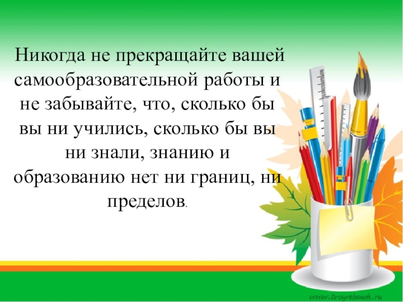 Слайд 15Никогда не прекращайте вашей самообразовательной работы и не забывайте, что, сколько