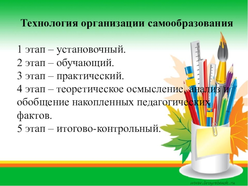 Технология организации самообразования1 этап – установочный. 2 этап – обучающий. 3 этап – практический. 4 этап –