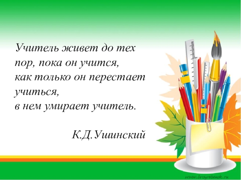Слайд 2Учитель живет до тех пор, пока он учится, как только он перестает