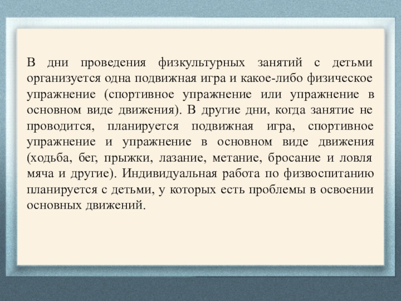 игра и какое-либо физическое упражнение (спортивное упражнение или упражнение в основном виде движения). В другие дни, когда занятие не проводится, планируется подвижная игра, спортивное упражнение и упражнение в основном виде движения (ходьба, бег, прыжки, лазание, метание, бросание и ловля мяча и другие). Индивидуальная работа по физвоспитанию планируется с детьми, у которых есть проблемы в освоении основных движений.