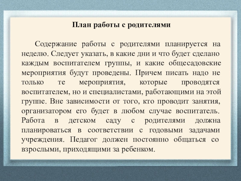 неделю. Следует указать, в какие дни и что будет сделано каждым воспитателем группы, и какие общесадовские мероприятия будут проведены. Причем писать надо не только те мероприятия, которые проводятся воспитателем, но и специалистами, работающими на этой группе. Вне зависимости от того, кто проводит занятия, организатором его будет в любом случае воспитатель. Работа в детском саду с родителями должна планироваться в соответствии с годовыми задачами учреждения. Педагог должен постоянно общаться со взрослыми, приходящими за ребенком.