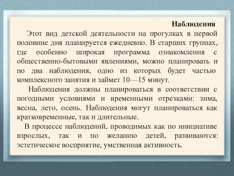 половине дня планируется ежедневно. В старших группах, где особенно широкая программа ознакомления с общественно-бытовыми явлениями, можно планировать и по два наблюдения, одно из которых будет частью комплексного занятия и займет 10—15 минут.