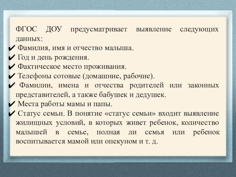 Слайд 20ФГОС ДОУ предусматривает выявление следующих данных:
