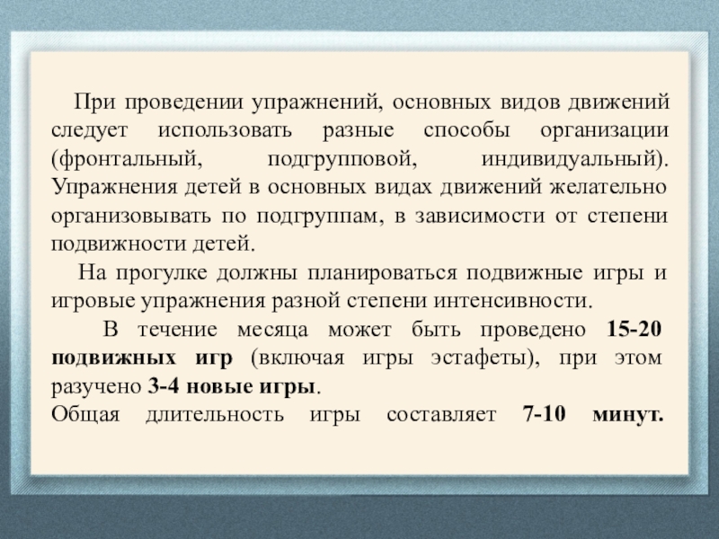 разные способы организации (фронтальный, подгрупповой, индивидуальный). Упражнения детей в основных видах движений желательно организовывать по подгруппам, в зависимости от степени подвижности детей.