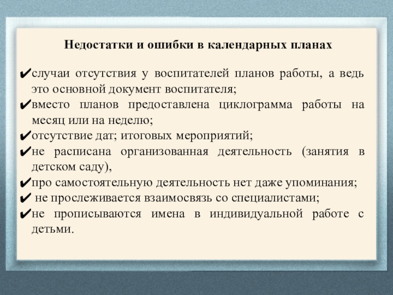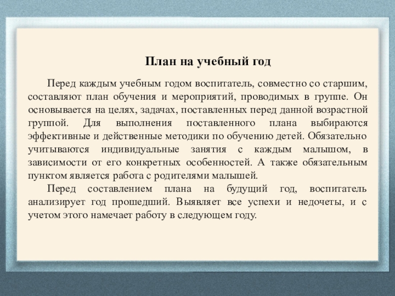 Перед составлением плана на будущий год, воспитатель анализирует год прошедший. Выявляет все успехи и недочеты, и с учетом этого намечает работу в следующем году.