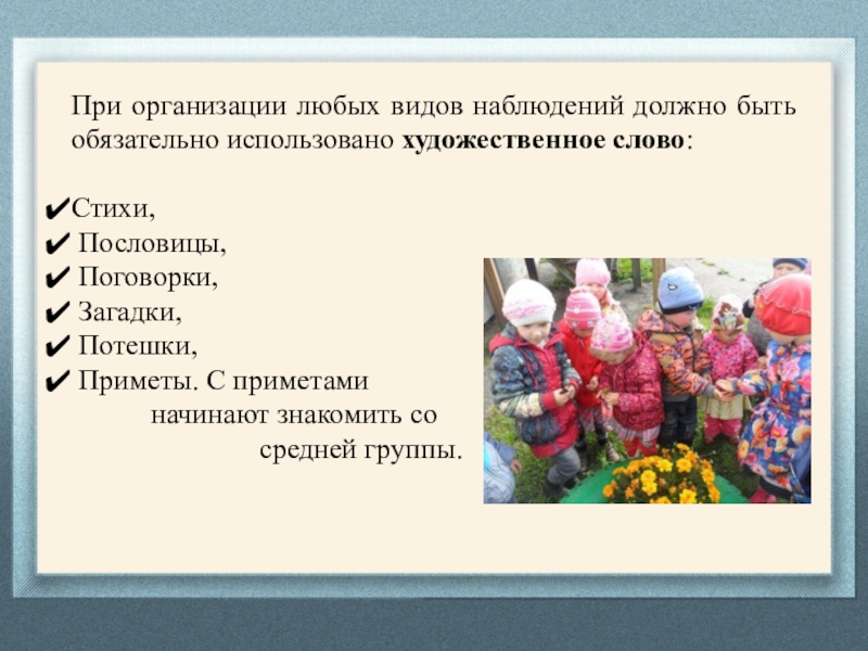 Слайд 12При организации любых видов наблюдений должно быть обязательно использовано художественное слово: