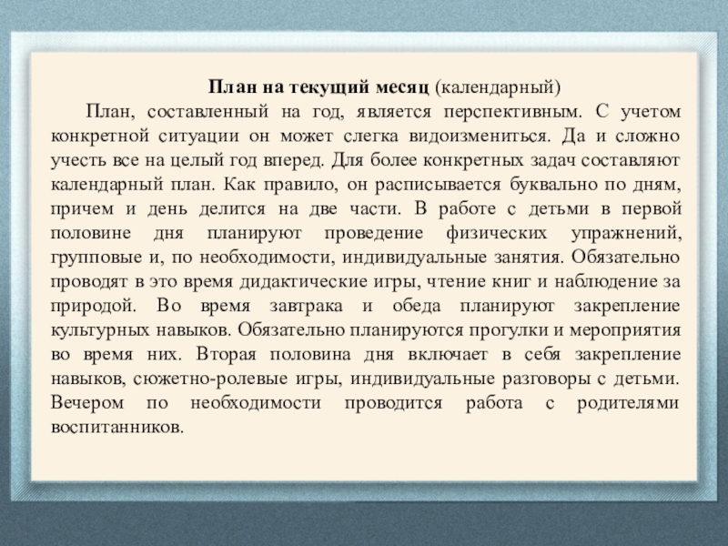 учетом конкретной ситуации он может слегка видоизмениться. Да и сложно учесть все на целый год вперед. Для более конкретных задач составляют календарный план. Как правило, он расписывается буквально по дням, причем и день делится на две части. В работе с детьми в первой половине дня планируют проведение физических упражнений, групповые и, по необходимости, индивидуальные занятия. Обязательно проводят в это время дидактические игры, чтение книг и наблюдение за природой. Во время завтрака и обеда планируют закрепление культурных навыков. Обязательно планируются прогулки и мероприятия во время них. Вторая половина дня включает в себя закрепление навыков, сюжетно-ролевые игры, индивидуальные разговоры с детьми. Вечером по необходимости проводится работа с родителями воспитанников.