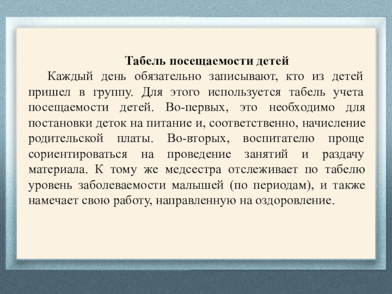 в группу. Для этого используется табель учета посещаемости детей. Во-первых, это необходимо для постановки деток на питание и, соответственно, начисление родительской платы. Во-вторых, воспитателю проще сориентироваться на проведение занятий и раздачу материала. К тому же медсестра отслеживает по табелю уровень заболеваемости малышей (по периодам), и также намечает свою работу, направленную на оздоровление.