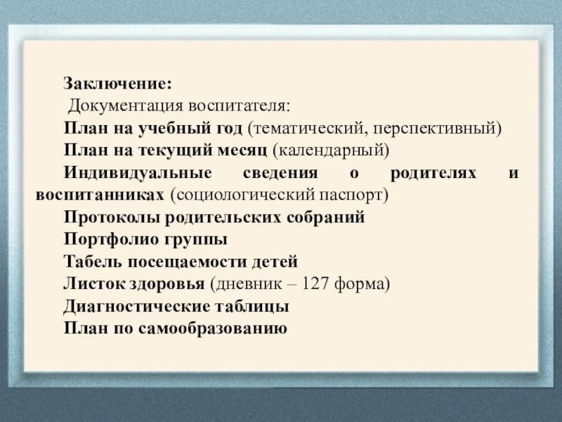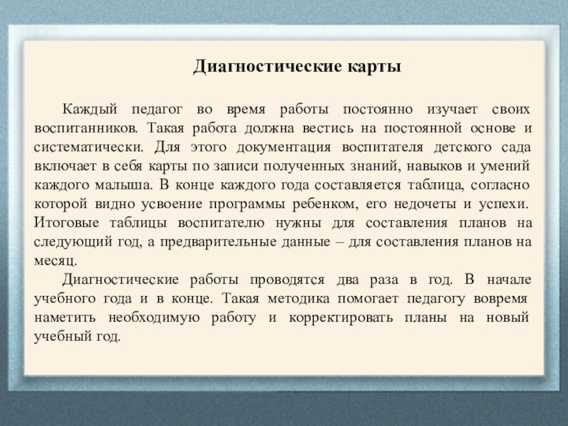 воспитанников. Такая работа должна вестись на постоянной основе и систематически. Для этого документация воспитателя детского сада включает в себя карты по записи полученных знаний, навыков и умений каждого малыша. В конце каждого года составляется таблица, согласно которой видно усвоение программы ребенком, его недочеты и успехи. Итоговые таблицы воспитателю нужны для составления планов на следующий год, а предварительные данные – для составления планов на месяц.