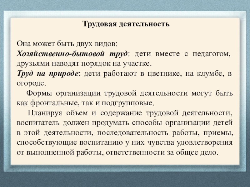 Планируя объем и содержание трудовой деятельности, воспитатель должен продумать способы организации детей в этой деятельности, последовательность работы, приемы, способствующие воспитанию у них чувства удовлетворения от выполненной работы, ответственности за общее дело.