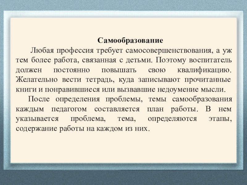 связанная с детьми. Поэтому воспитатель должен постоянно повышать свою квалификацию. Желательно вести тетрадь, куда записывают прочитанные книги и понравившиеся или вызвавшие недоумение мысли.