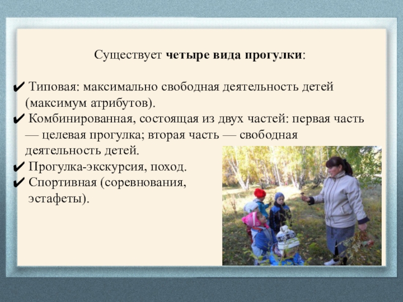 проведение двух прогулок: утренней и вечерней (не считая утреннего приема детей на воздухе). Задача прогулки в первую половину дня – восстановить силы после занятий, получить максимальный положительный заряд.