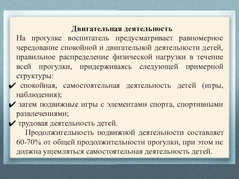 Продолжительность подвижной деятельности составляет 60-70% от общей продолжительности прогулки, при этом не должна ущемляться самостоятельная деятельность детей.