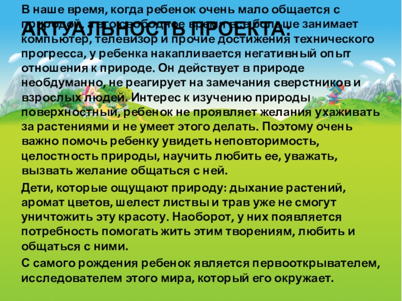 а его свободное время все больше занимает компьютер, телевизор и прочие достижения технического прогресса, у ребенка накапливается негативный опыт отношения к природе. Он действует в природе необдуманно, не реагирует на замечания сверстников и взрослых людей. Интерес к изучению природы поверхностный, ребенок не проявляет желания ухаживать за растениями и не умеет этого делать. Поэтому очень важно помочь ребенку увидеть неповторимость, целостность природы, научить любить ее, уважать, вызвать желание общаться с ней.
