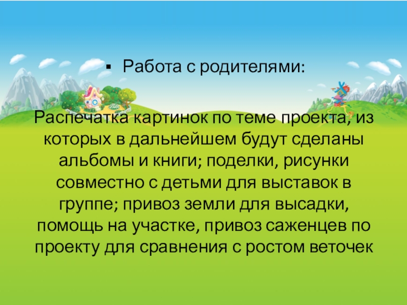 будут сделаны альбомы и книги; поделки, рисунки совместно с детьми для выставок в группе; привоз земли для высадки, помощь на участке, привоз саженцев по проекту для сравнения с ростом веточек