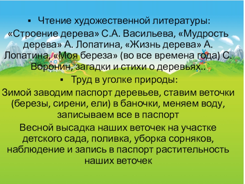 дерева» А. Лопатина, «Моя береза» (во все времена года) С. Воронин, загадки и стихи о деревьях..