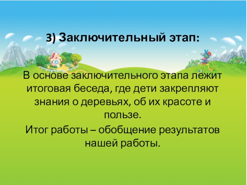 В основе заключительного этапа лежит итоговая беседа, где дети
