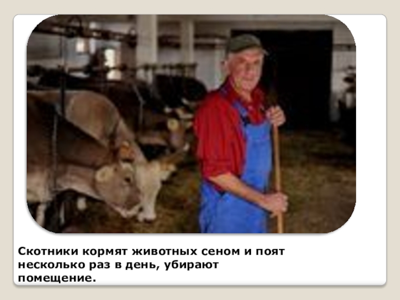 Слайд 9Скотники кормят животных сеном и поят несколько раз в день, убирают