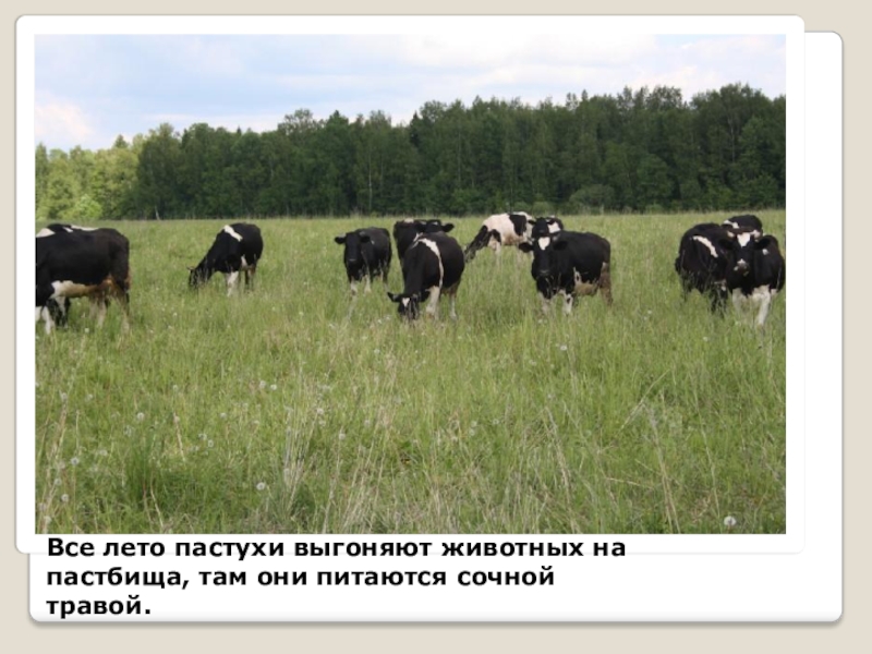 Слайд 7Все лето пастухи выгоняют животных на пастбища, там они питаются сочной