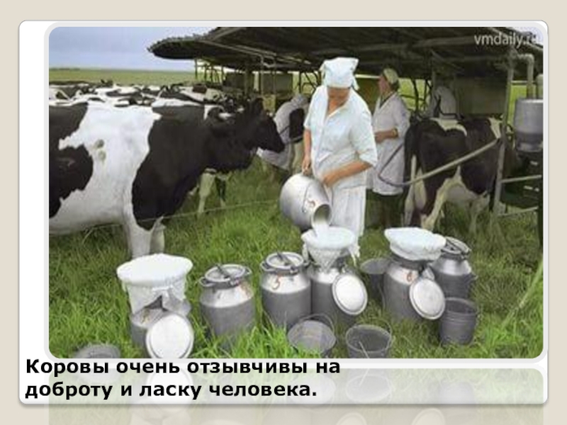 Слайд 13Коровы очень отзывчивы на доброту и ласку человека.