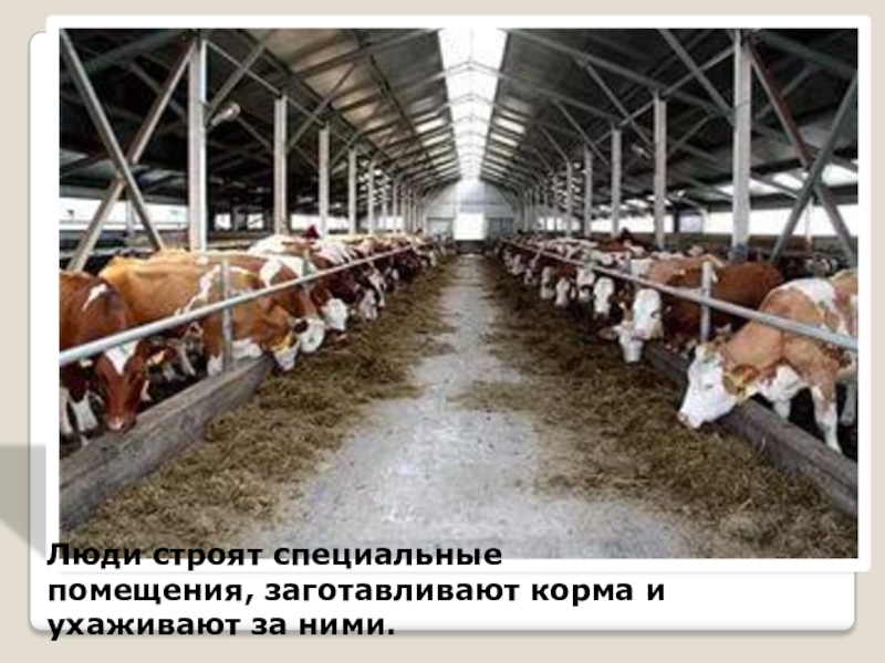 Слайд 8Люди строят специальные помещения, заготавливают корма и ухаживают за ними.
