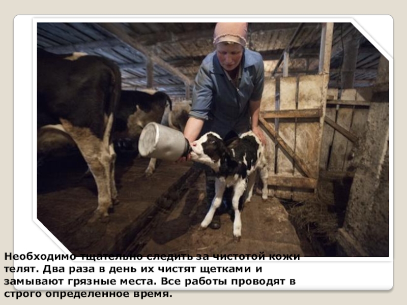 Слайд 11Необходимо тщательно следить за чистотой кожи телят. Два раза в день