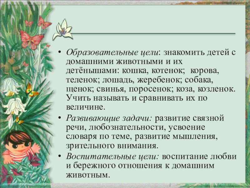 Образовательные цели: знакомить детей с домашними животными и их детёнышами: кошка, котенок;  корова, теленок; лошадь, жеребенок; собака, щенок; свинья, поросенок; коза, козленок. Учить называть и сравнивать их по величине.Развивающие задачи: развитие связной речи, любознательности, усвоение словаря