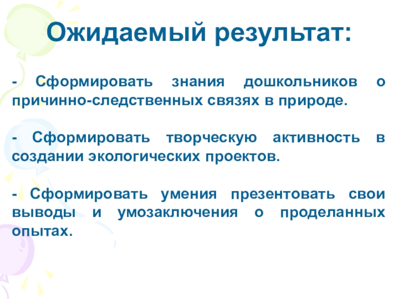Ожидаемый результат:- Сформировать знания дошкольников о причинно-следственных связях в природе.- Сформировать творческую активность в создании экологических проектов.-