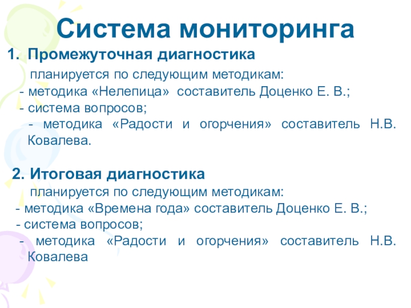 Система мониторингаПромежуточная диагностика   планируется по следующим методикам: - методика «Нелепица» составитель Доценко Е. В.; -