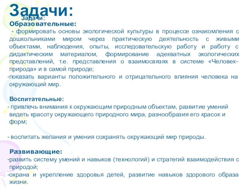 Задачи: Задачи:Образовательные: - формировать основы экологической культуры в процессе ознакомления с дошкольниками миром через практическую деятельность с