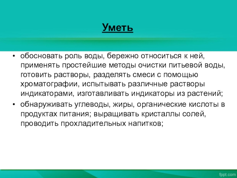 обосновать роль воды, бережно относиться к ней, применять простейшие методы очистки